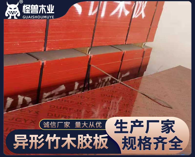 異形竹木膠板:竹膠板用竹子做的多層膠合板,木膠板就是木材及木鋸末做的膠合板。竹膠板比木膠合板耐用,周轉次數較多,剛度好,價格較高。但是木膠板在梁底等部位使用效果要好于竹膠板。